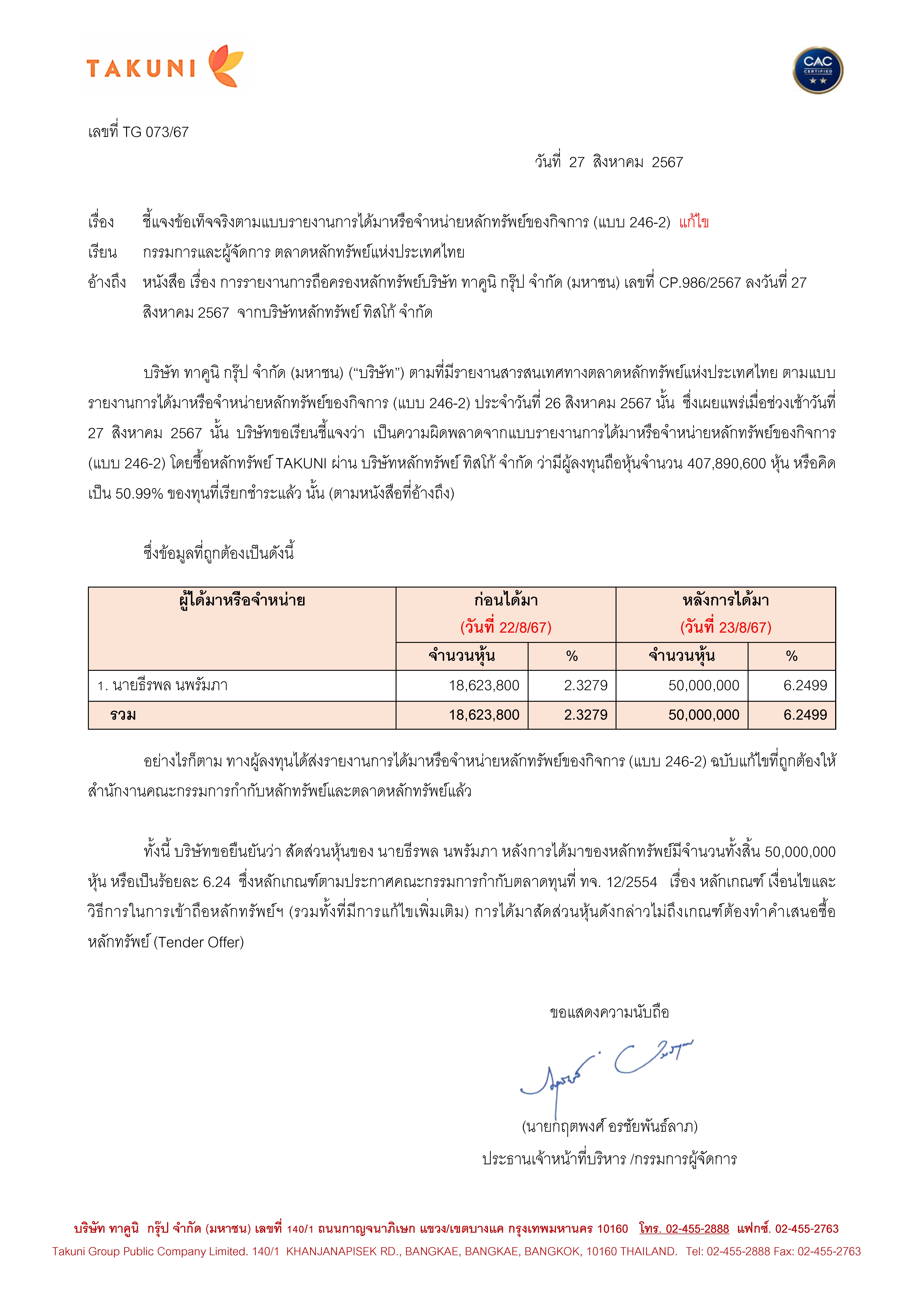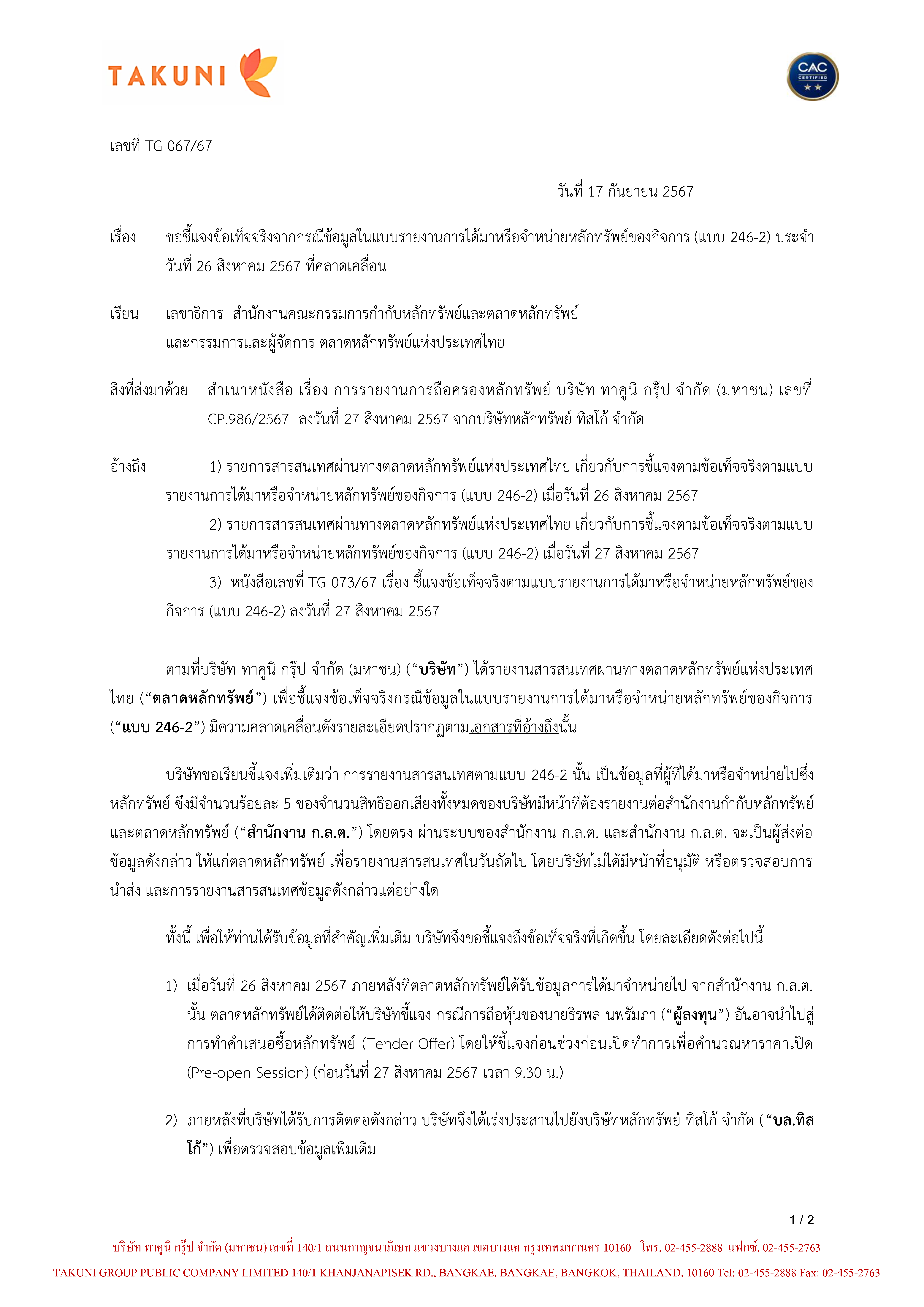 บริษัท ทาคูนิ กรุ๊ป จำกัด (มหาชน) ขอเรียนชี้แจงข้อเท็จจริงจากกรณีข้อมูลในแบบรายงานการได้มาหรือจำหน่า