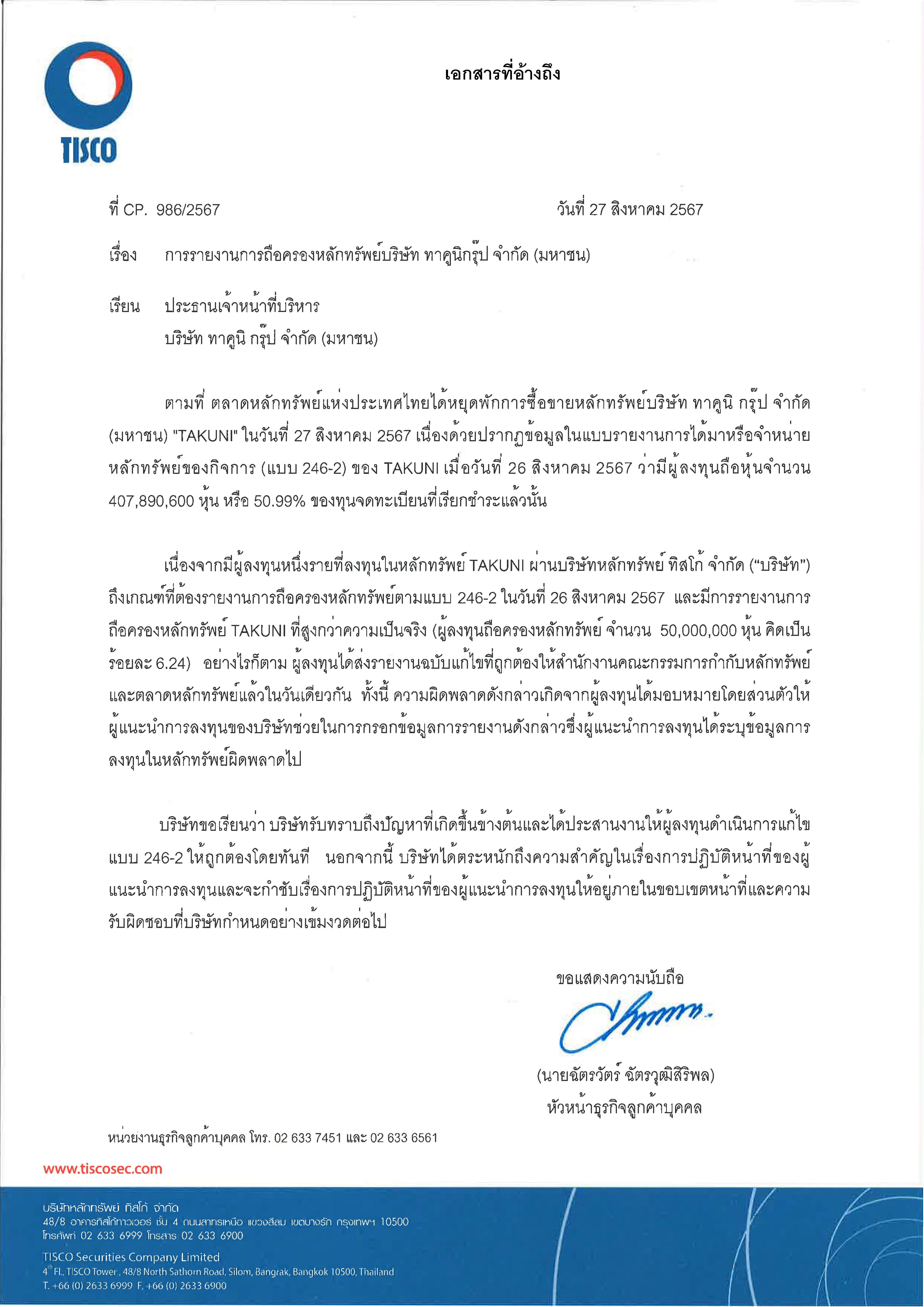 ชี้แจงข้อเท็จจริงตามแบบรายงานการได้มาหรือจำหน่ายหลักทรัพย์ของกิจการ (แบบ 246-2)